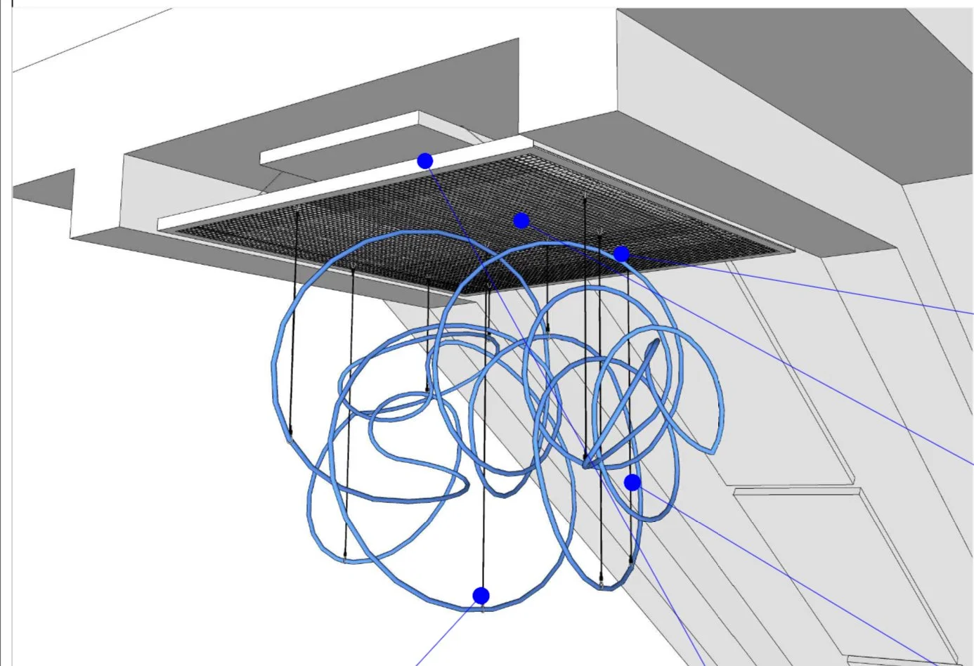 SUSPENDED USING TECHNI CABLE AND GRIPPLES FROM A STEEL MESH GRID